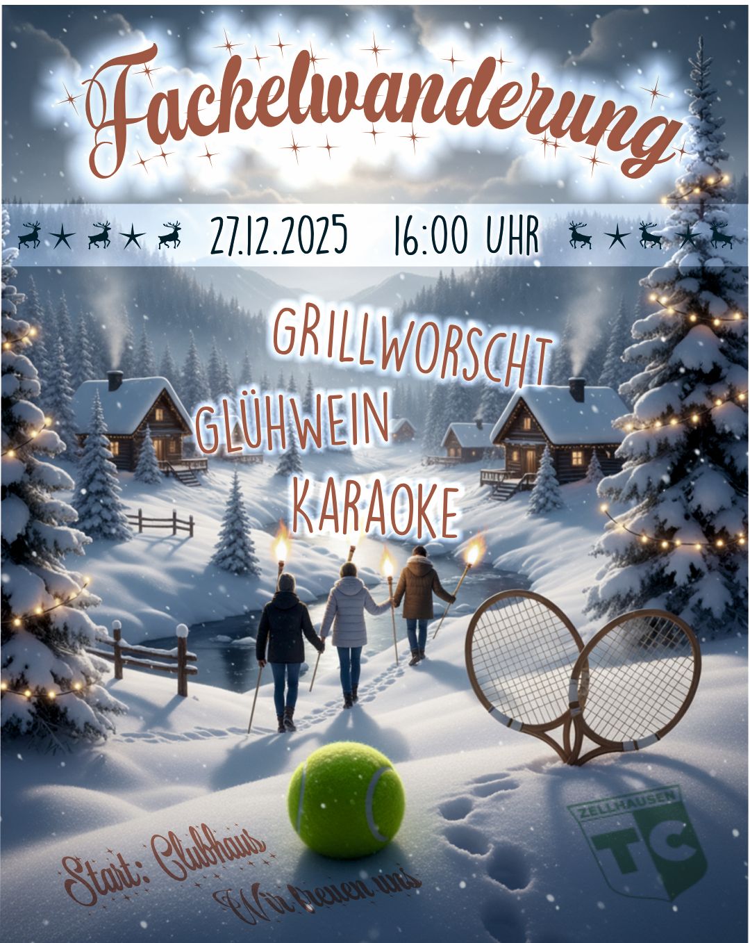 Am 27.12. machen wir uns gemeinsam auf den Weg und laufen mit Fackeln vom Clubhaus bis zur Hütte & zurück und lassen den Abend mit Grillen und Glühwein ausklingen!